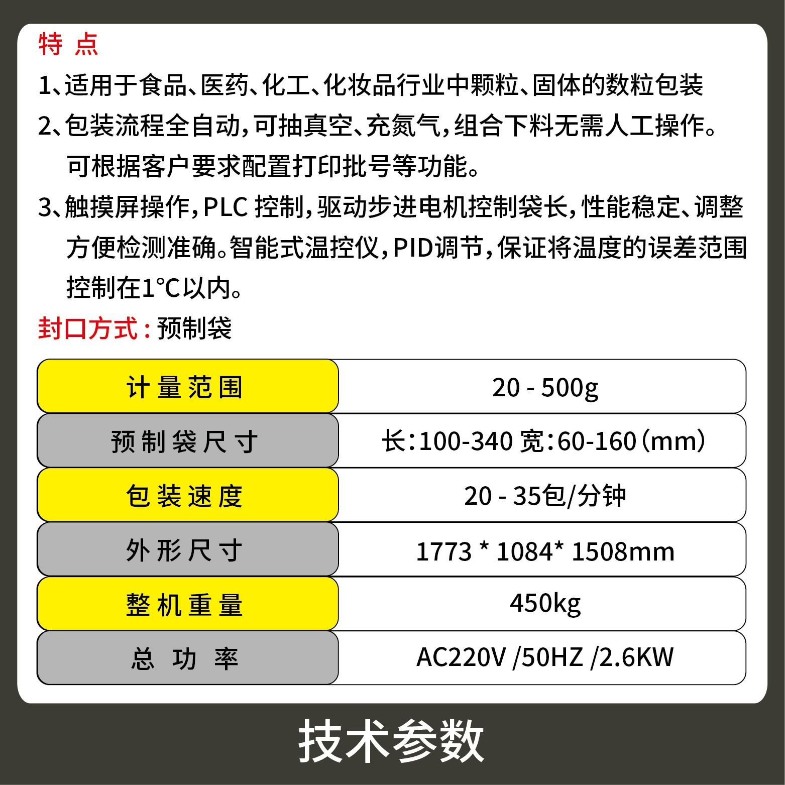 2、包裝流程全自動(dòng),無(wú)需人工操作,可抽真空、充氮?dú)?,組合下料??筛鶕?jù)充填物料的性質(zhì)選配不同的下料結(jié)構(gòu),且可根據(jù)客戶要求配置打印批號(hào)等功能。